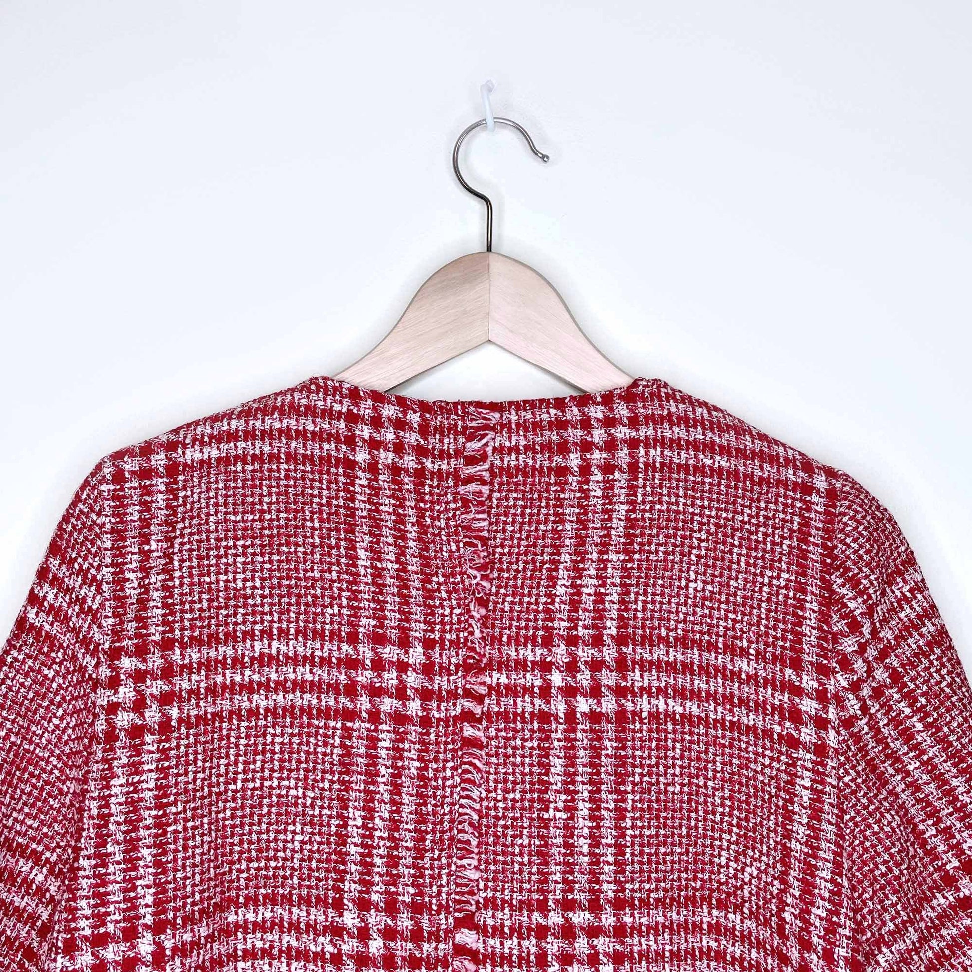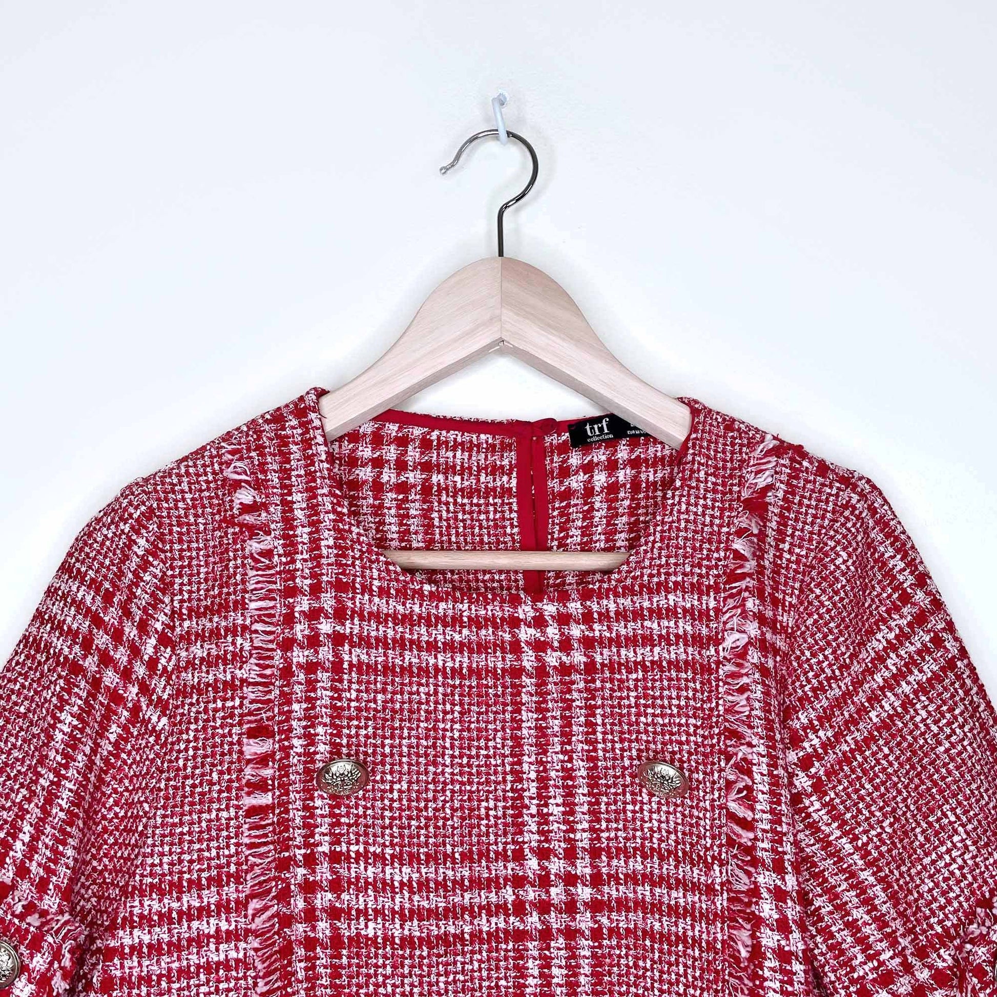 zara trf red tweed short sleeve fringe top with gold buttons - size medium